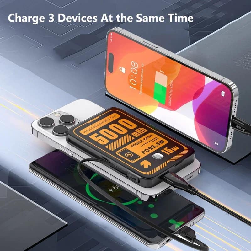 All-in-One Wireless Charging Station: A power bank with a built-in wireless charging pad on top. Drop your phone to charge—no separate pad or cable needed.